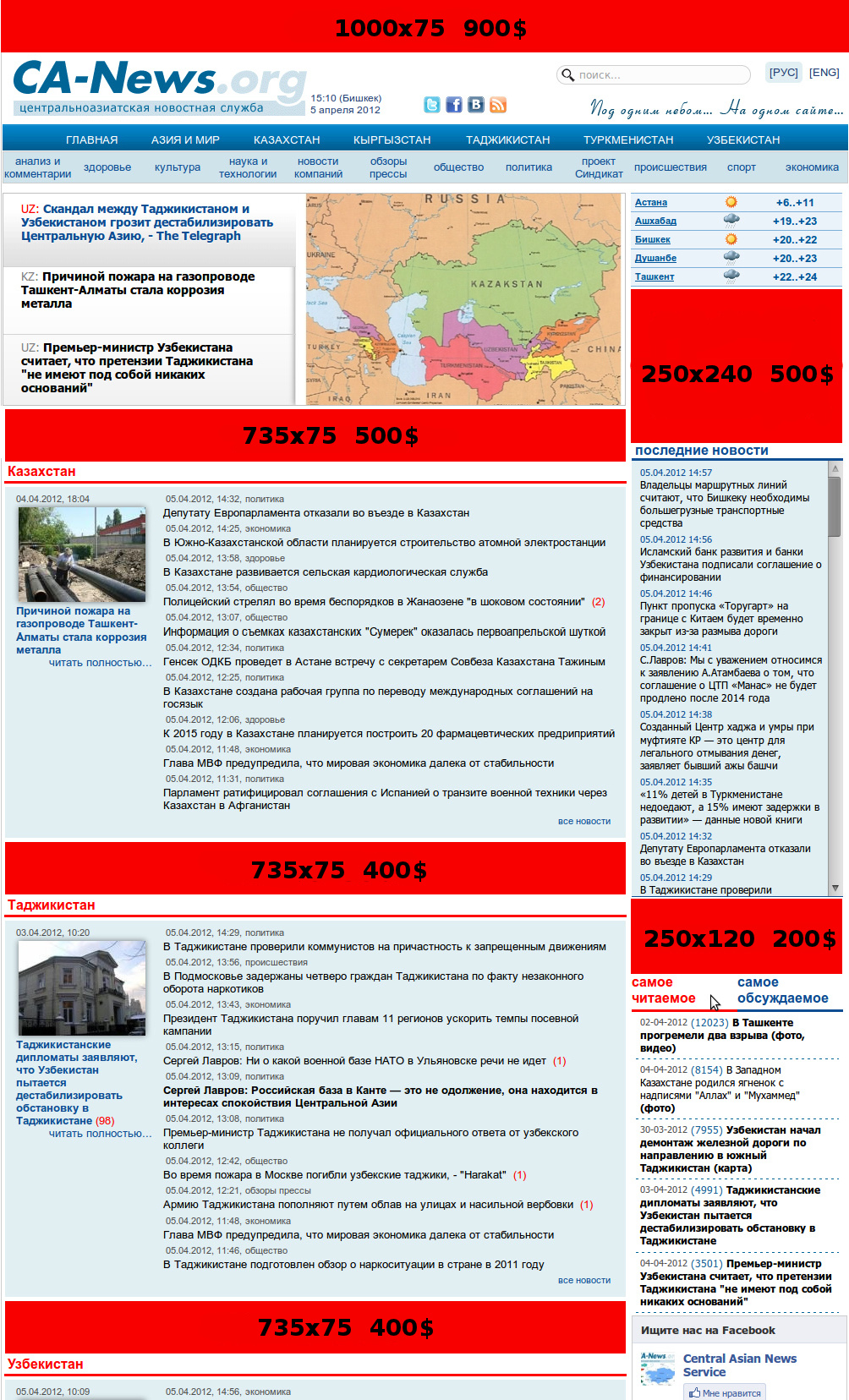 CentralAsia (KZ) -  CA-News Центральноазиатская новостная служба (CA-News) объявляет о начале новогодней распродажи баннеров на сайте. CA-News, имея широкую аудиторию в странах Центральной Азии, предлагает компаниям стран ЦА региона воспользоваться шансом и дать рекламу на одном из самых посещаемых ресурсов ЦА. Баннерная реклама будет размещаться на главной странице и в новостных блоках, в зависимости от выбора места, сроком на два месяца.