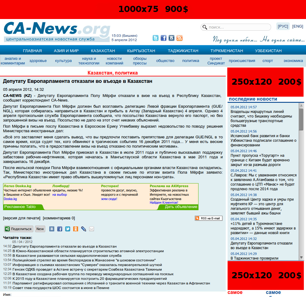 Размер, место и стоимость разрещения баннера на два месяца на CA-News.org: