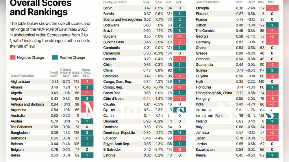 Недавно представлен Индекс верховенства права за 2025 год от Всемирного проекта по справедливости (World Justice Project), охватывающий 143 страны. Этот рейтинг формируется на основе опросов граждан и экспертных мнений по восьми ключевым критериям, включая ограничения власти государства и эффективность правосудия как в гражданских, так и в уголовных делах. Каждой стране присваивается балл от 0 до 1, где 1 указывает на полное соблюдение принципов верховенства закона, а 0 — на их полное отсутствие.