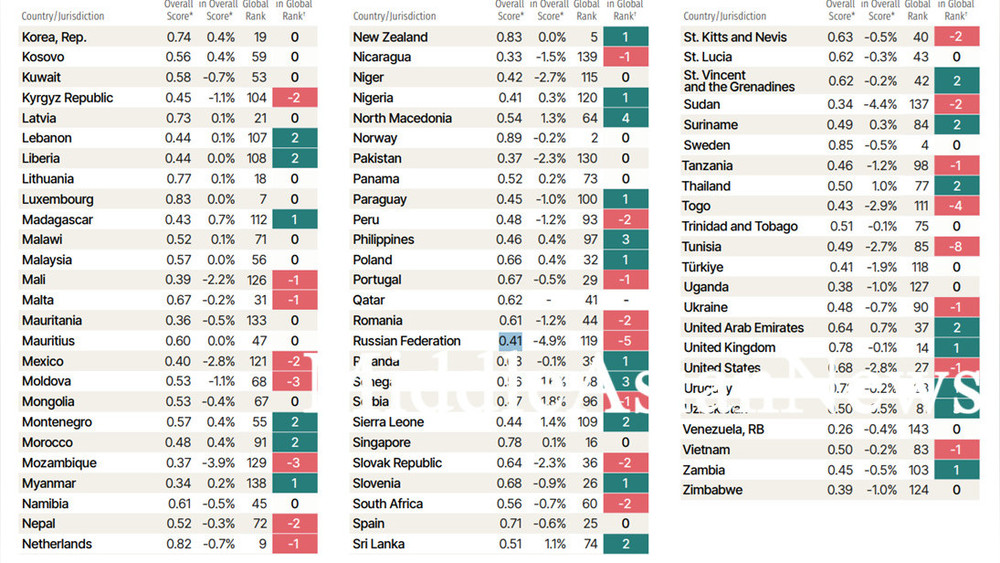 Последние позиции в рейтинге занимают Камбоджа (141-е место с показателем 0.31), Афганистан (142-е место с показателем 0.31) и Венесуэла (143-е место с показателем 0.26).