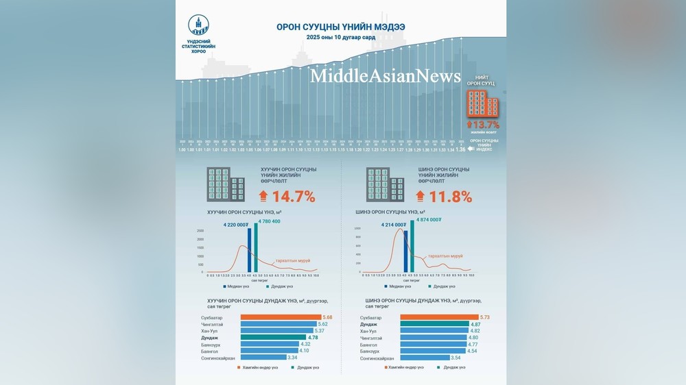 По сравнению с аналогичным периодом 2024 года средняя цена старых квартир выросла больше всего в районе Хан-Уул — на 18.8 процента, а наименьший рост был зафиксирован в районе Баянгол — на 10.2 процента.