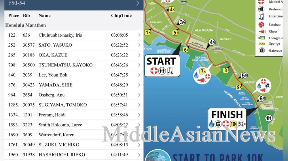 В программе приняла участие Ирис Чулуунбат-наски, монгольская бегунья, проживающая в Сиэтле, США, которой в этом году исполняется 54 года. Она показала отличное время 3:08:05, за ней следовали японские бегуньи Ясока Сато (03:22:52) и Оке Казуэ (03:23:22), занявшие второе и третье места соответственно.
