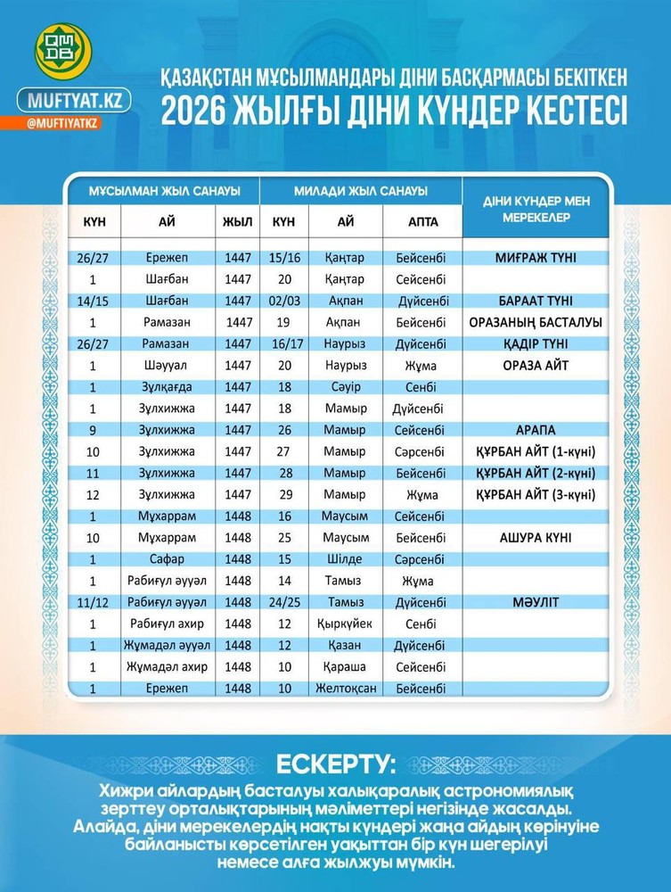Священный месяц продлится 29 дней. Согласно расписанию ночь аль-Кадр пройдёт с 16 на 17 марта. Ораза айт будет отмечаться в пятницу, 20 марта.