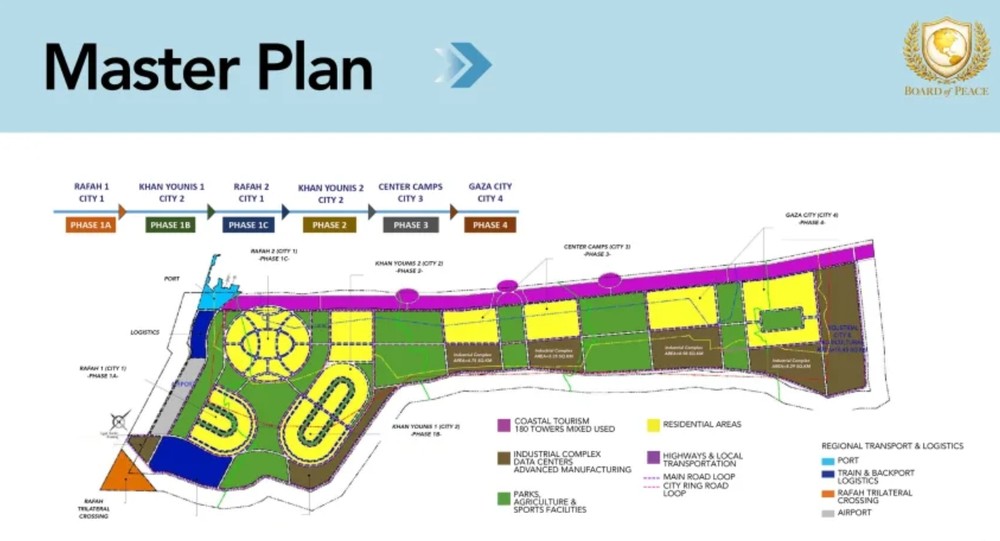 Кушнер выделил два городских проекта — «Новый Рафах» и «Новая Газа». В «Новом Рафахе» будет построено более 100 тысяч постоянных жилых единиц, а также более 200 школ и более 75 медицинских учреждений. Он выразил надежду, что строительство будет завершено в течение двух-трех лет и сообщил, что работы по расчистке завалов уже начались.